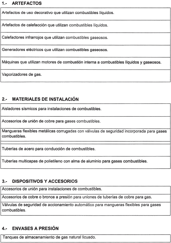 2º. Establécese que para la comercialización de los productos indicados a continuación, éstos deban contar previamente con un certificado de aprobación otorgado por un organismo de certificación autorizado por la Superintendencia de Electricidad y Combustibles: