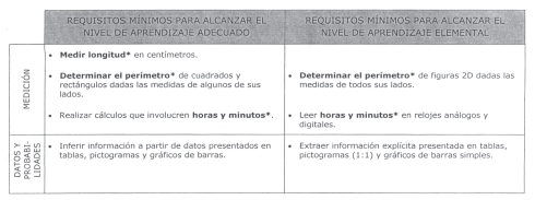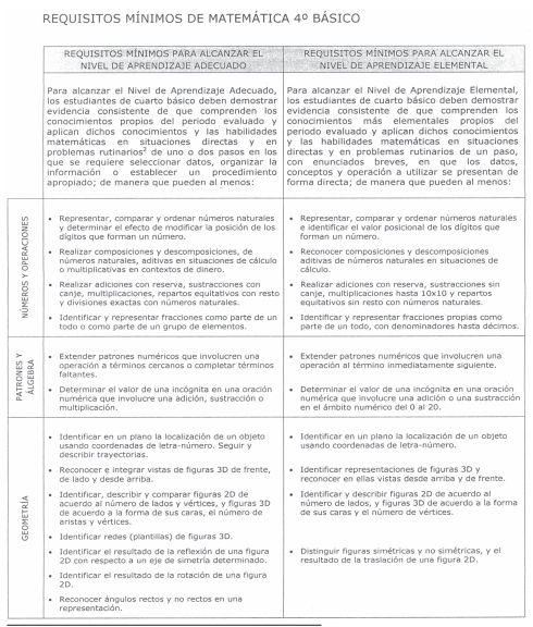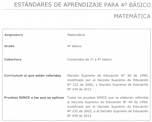 * Los Niveles de Aprendizaje de Matemática 4º básico se establecieron a partir del Marco Curricular 2002 (decreto supremo de Educación Nº 232 que modifica el decreto supremo de Educación Nº 40 de 1996) y las Bases Curriculares 2012 (decreto supremo de Educación Nº 439). Sin embargo, los contenidos en negrita forman parte sólo de las Bases Curriculares 2012 y entrarán en vigencia una vez que las pruebas SIMCE se construyan a partir de éstas.