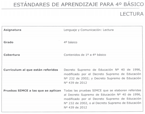 Este documento presenta los Estándares de Aprendizaje de 4º y 8º básico para las asignaturas de Matemática; Lenguaje y Comunicación: Lectura; Ciencias Naturales; e Historia, Geografía y Ciencias Sociales. La elaboración de los Estándares de Aprendizaje se inscribe dentro de las exigencias del nuevo marco normativo que rige el sistema educacional en Chile, el cual se define en la Ley General de Educación (ley Nº 20.370) promulgada el año 2009, y en la ley que establece el Sistema Nacional de Aseguramiento de la Calidad de la Educación Parvularia, Básica y Media y su Fiscalización (ley Nº 20.529), promulgada el año 2011.