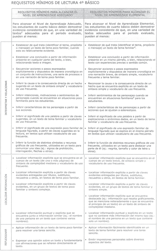 En la prueba SIMCE, estos estudiantes muestran escasa evidencia de que al leer diversos tipos de textos apropiados para cuarto básico son capaces de: Alcanzar una comprensión global de lo leído; realizar inferencias directas; localizar información explícita que aparece en el cuerpo de un texto; y reflexionar sobre la lectura para emitir impresiones personales sobre diversos aspectos del texto.